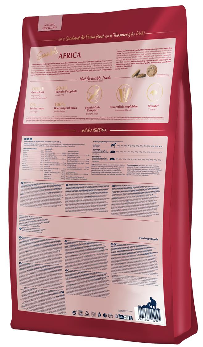 Kartoffeln sind glutenfrei und sind für Tiere mit Getreideunverträglichkeiten zu empfehlen. Strauss als seltene und exklusive Proteinquelle zeichnet sich durch eine optimale Verträglichkeit aus. Wertvolle Omega-3 und Omega-6 Fettsäuren sind wichtig für eine gesunde Haut und ein glänzendes Fell und runden die exklusive Rezeptur ab. Dies macht Supreme Sensible Africa zu einem ausgewogenen und idealen Trockenfutter für Hunde mit Allergien und Futtermittelunverträglichkeiten. Die außergewöhnlich schmackhafte Super-Premium-Vollnahrung Happy Dog Africa ist zudem ideal für alle anspruchsvollen, ausgewachsenen Feinschmecker ab 11 kg, die Abwechslung suchen oder sehr wählerisch sind.