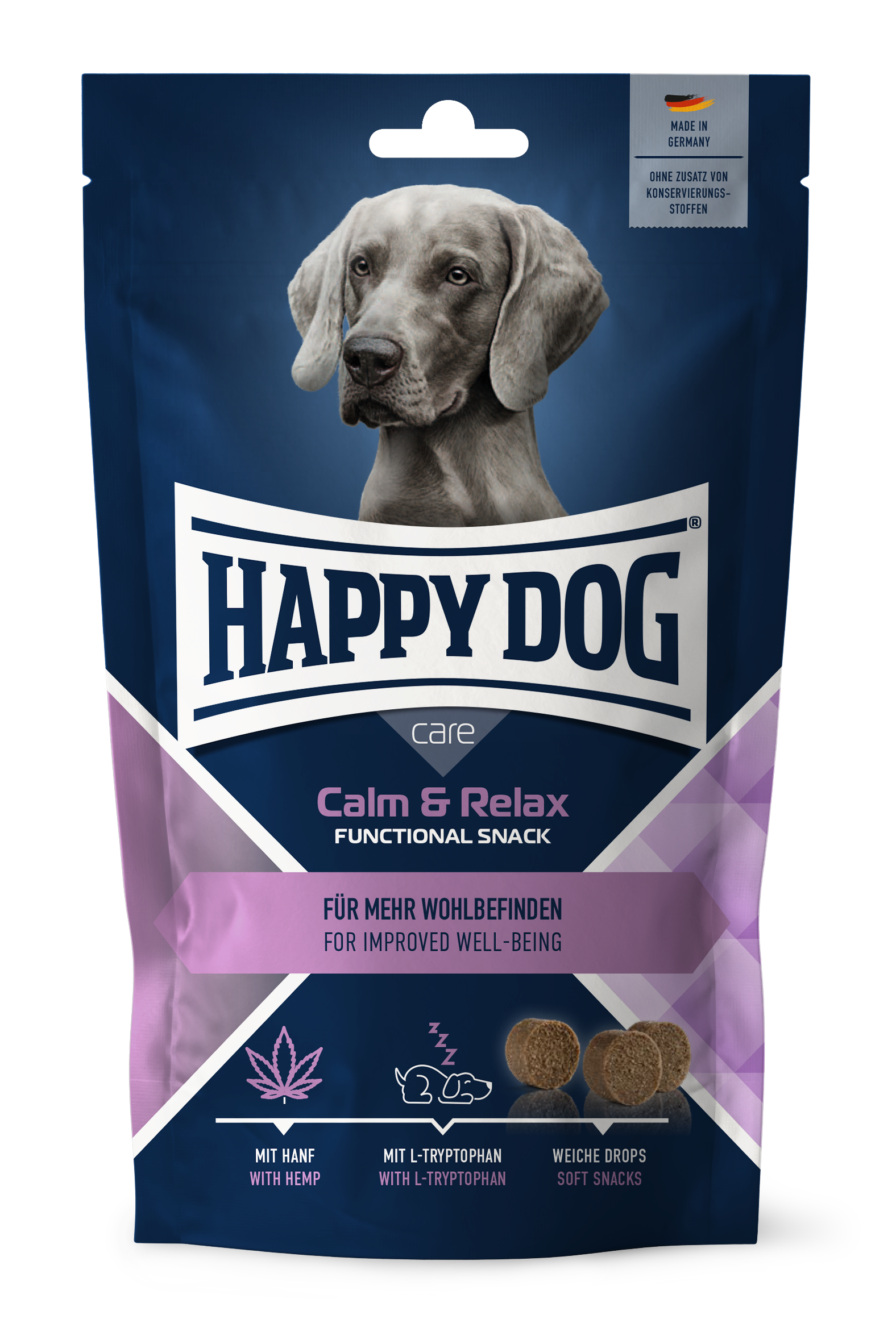 Manche Vierbeiner kann so leicht nichts aus der Ruhe bringen. Andere hingegen reagieren auf Veränderungen, besondere Situationen oder Ereignisse sensibel. Ist dein Hund schnell überfordert, dann ist unser Happy Dog Care Snack Calm und Relax optimal für ihn geeignet. Die getreidefreie Rezeptur der Hundeleckerlis mit wertvollem Hanf, L-Tryptophan und Magnesium sorgt für kleine Wohlfühlmomente in herausfordernden Situationen, wie zum Beispiel bei Gewittern, an Silvester oder bei einem anstehenden Tierarztbesuch. Die weichen Drops dieses funktionellen Hundesnacks sind einfach in der Handhabung und perfekt zu dosieren. Hergestellt in Deutschland ohne Zusatz von Zucker und ohne künstliche Aroma-, Farb- und Konservierungsstoffe.