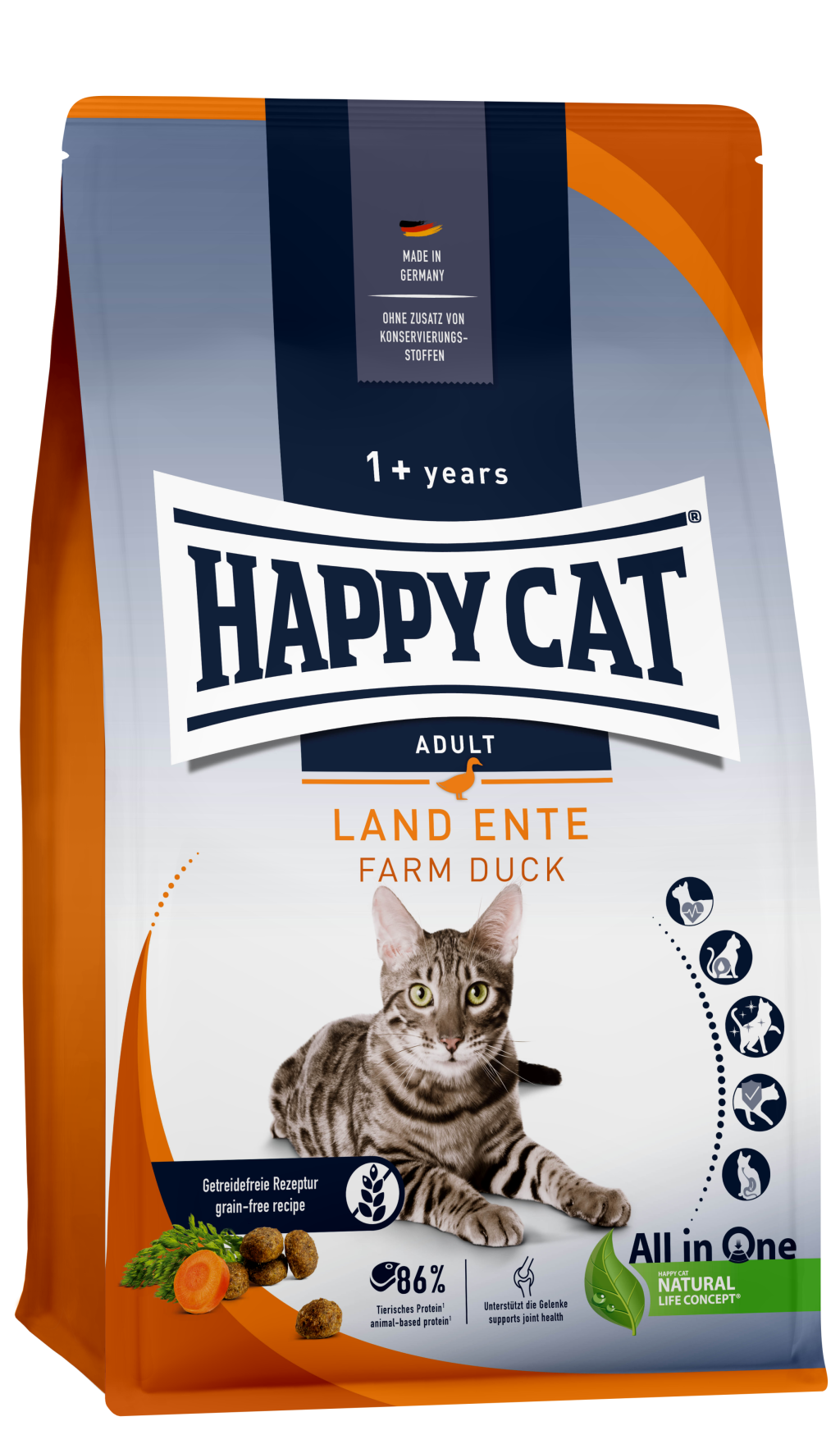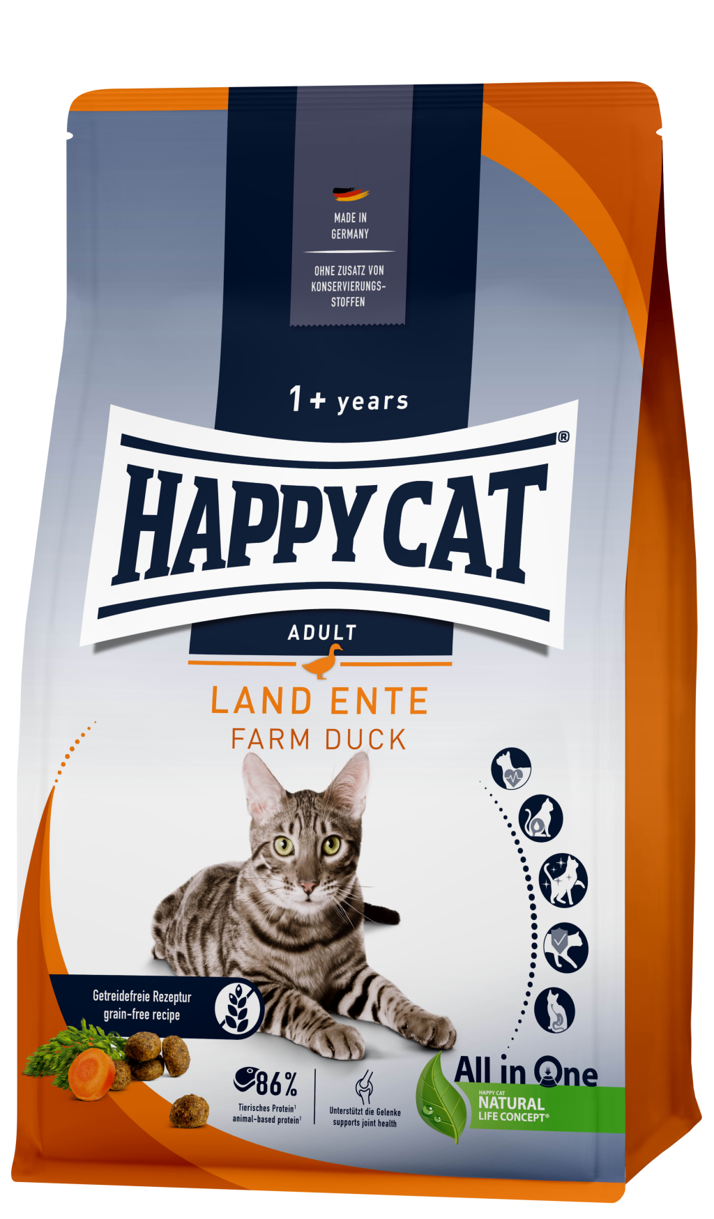 Die delikate Komposition aus zarter Land-Ente und feiner Karotte sorgt für eine ausgewogene Ernährung deiner Samtpfote. Die getreidefreie Rezeptur ist leicht verdaulich und enthält einen hohen Anteil an tierischem Protein. Dies ist besonders wichtig für die Muskulatur aktiver Katzen.