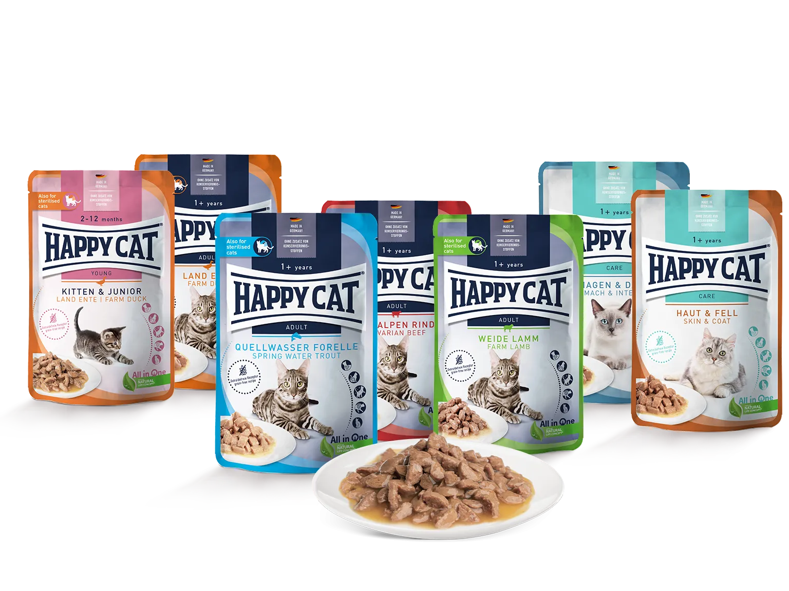 Happy Cat Meat in Sauce Culinary Atlantik-Lachs ist ein getreidefreies Katzen-Nassfutter mit feinem Fisch. Die leckere Rezeptur mit über 90 Prozent tierischen Proteinen am Gesamtprotein wird nach unserem, mit Tierärzten entwickelten, Natural Life Concept zubereitet – und kommt den fünf wichtigen Bereichen der Katzengesundheit zugute. Das All in One-Konzept mit allen wichtigen Vitaminen und Mineralstoffen macht zudem weitere Nahrungsergänzungsmittel überflüssig. Gutes Katzen-Nassfutter wie Meat in Sauce Culinary Atlantik-Lachs unterstützt die Gesundheit von Haut, Herz, Verdauungs- und Harntrakt. Wertvolle Omega 3- und Omega 6-Fettsäuren fördern die Vitalität und ein natürlich glänzendes Fell. Das Nassfutter für Katzen leistet ausserdem einen wichtigen Beitrag zum Flüssigkeitshaushalt. Unser Katzenfutter von Happy Cat zahlt nicht nur auf das Wohlbefinden deiner Samtpfote ein: Mit besten Zutaten aus verantwortungsvoller Erzeugung stehen wir für Nachhaltigkeit und hohe Qualität.