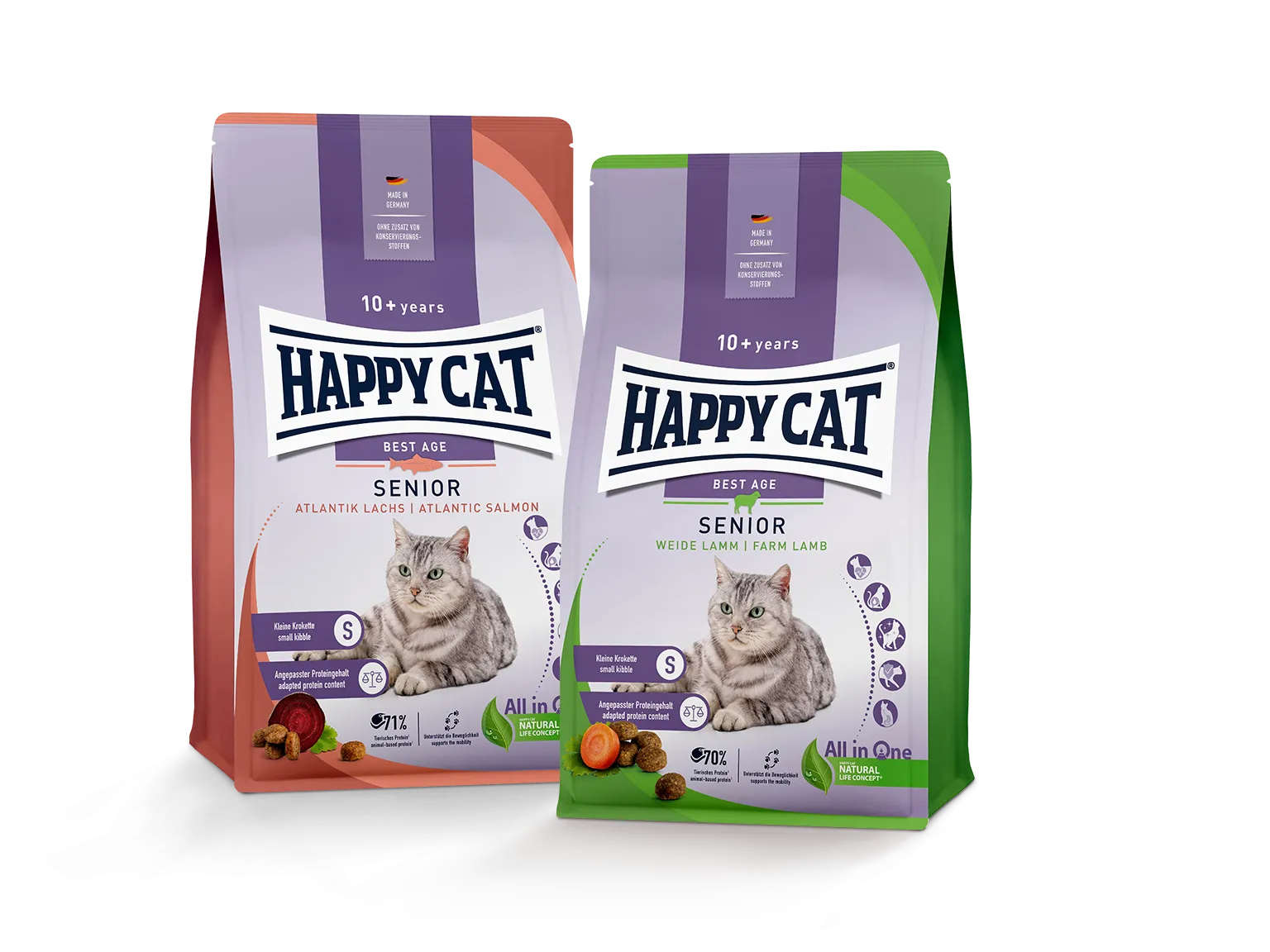 Die Rezepturen des Happy Cat Senior-Sortiments haben einen angepassten Protein- und Mineralstoffgehalt um die Organe der Seniorkatzen zu schonen. Leicht verdauliche Zutaten entlasten dabei den Stoffwechsel von älteren Katzen. Happy Cat Senior-Nahrung unterstützt gezielt ältere Katzen und sorgt so für ein langes und vitales Katzenleben.