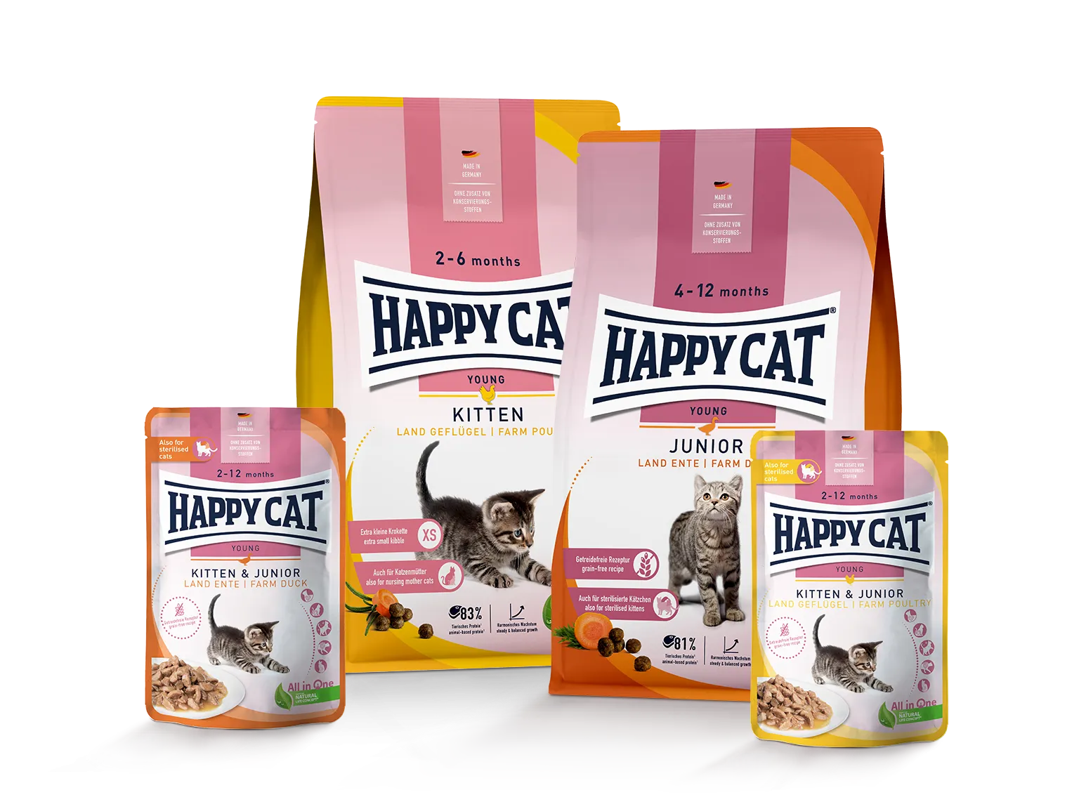 Dein Kitten frisst lieber Nassfutter? Kein Problem. Happy Cat Kitten und Junior Land-Geflügel gibt es auch als Nassfutter mit viel leckerer Sosse im praktischen Beutel.