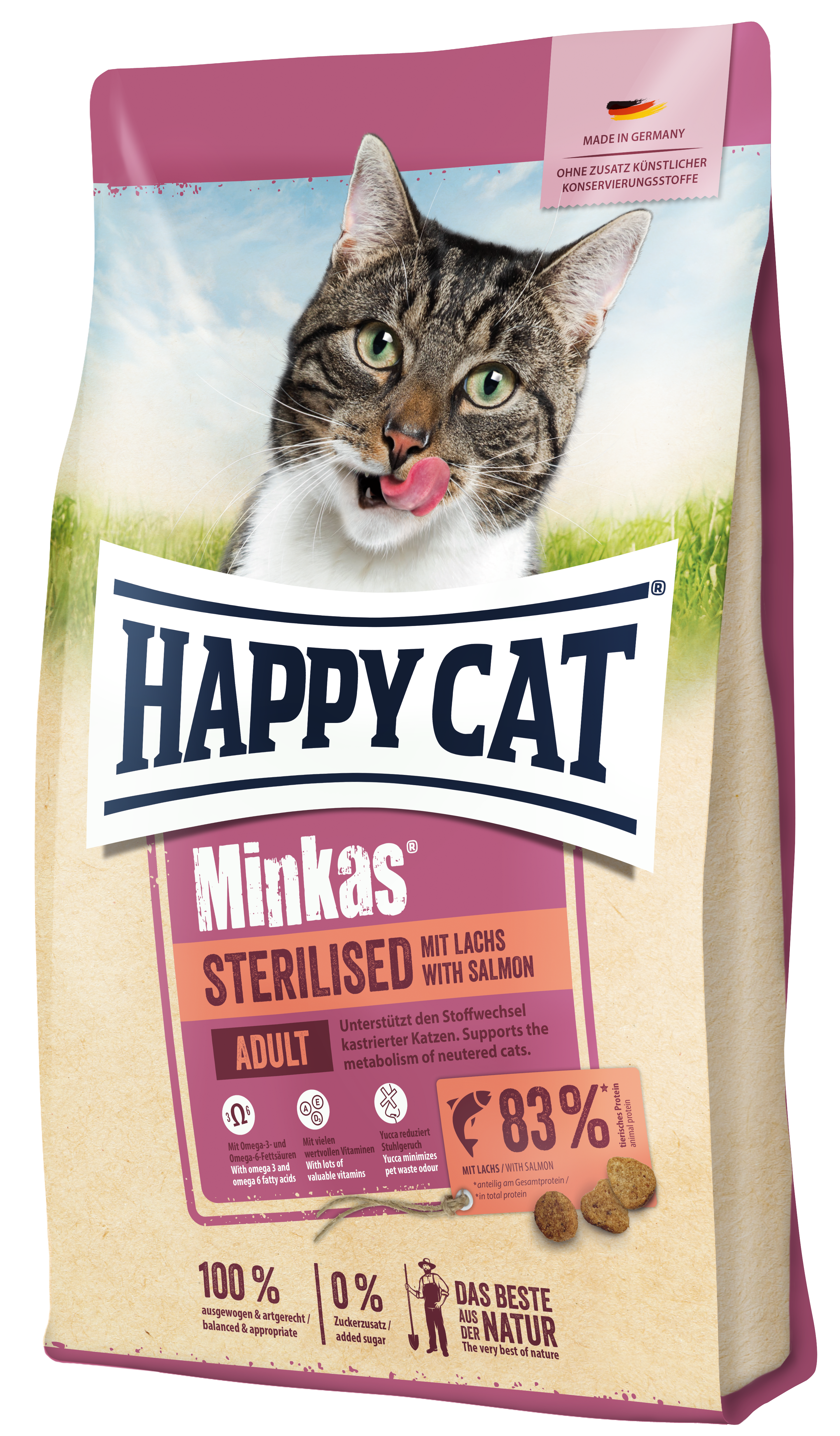 Happy Cat Minkas Sterilised mit Lachs ist ein gutes Trockenfutter, das speziell auf die Beduerfnisse kastrierter Katzen mit reduziertem Energiebedarf abgestimmt ist. Da sich der Stoffwechsel sterilisierter Katzen und kastrierter Kater veraendert und sie sich zudem nach der Kastration meist weniger bewegen als vorher, empfehlen wir auf das Gewicht kastrierter Katzen zu achten. In der Regel benoetigen Kastraten weniger Energie als unkastrierte Artgenossen. Daher ist Happy Cat Minkas Sterilised mit Lachs optimal für kastrierte Tiere geeignet.