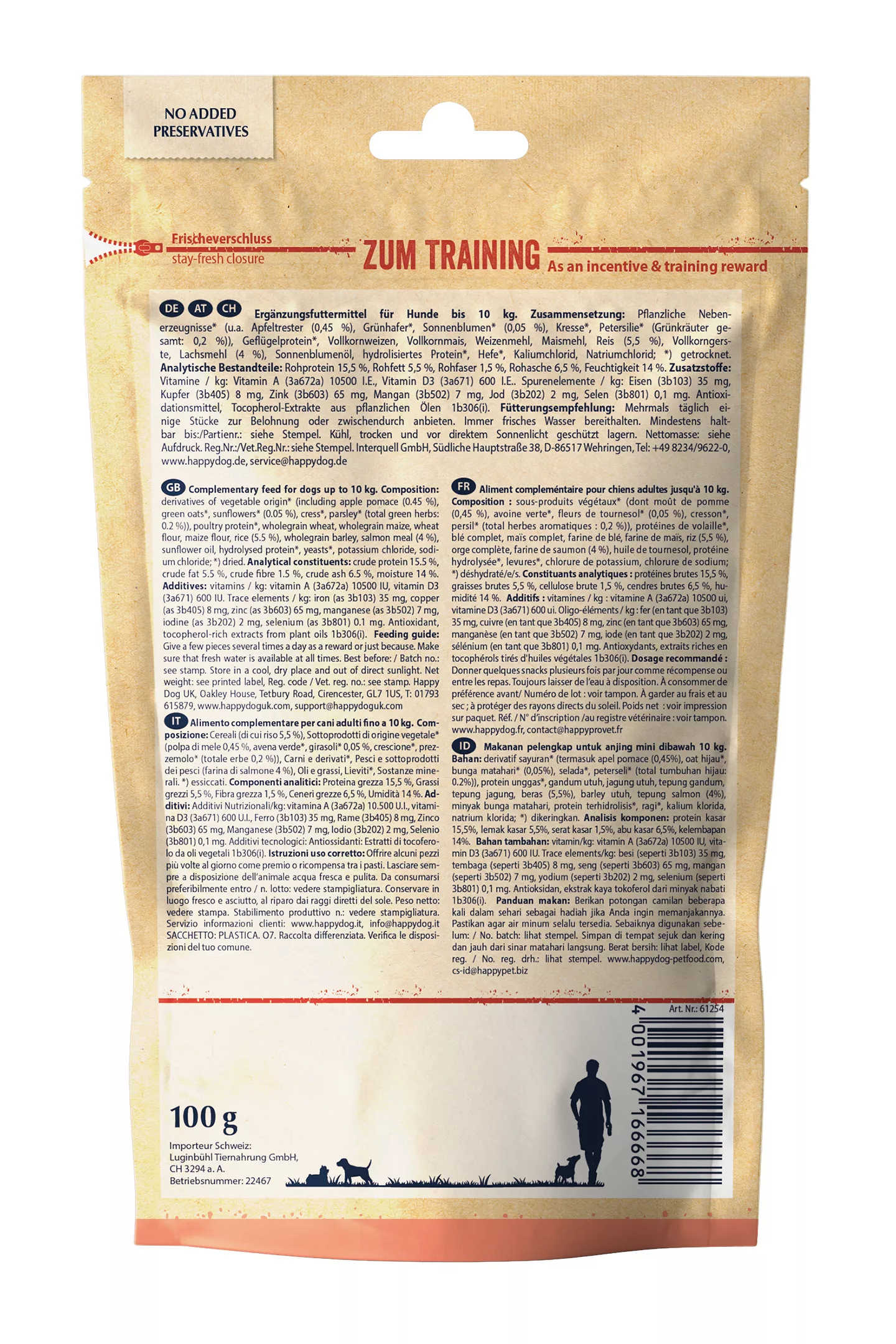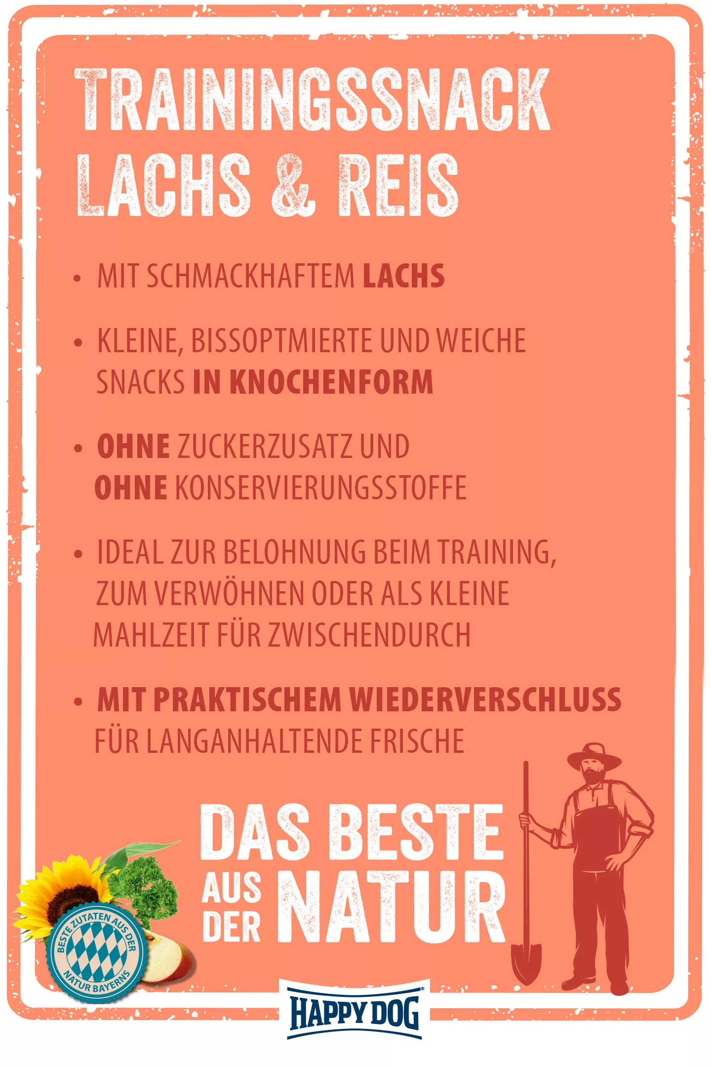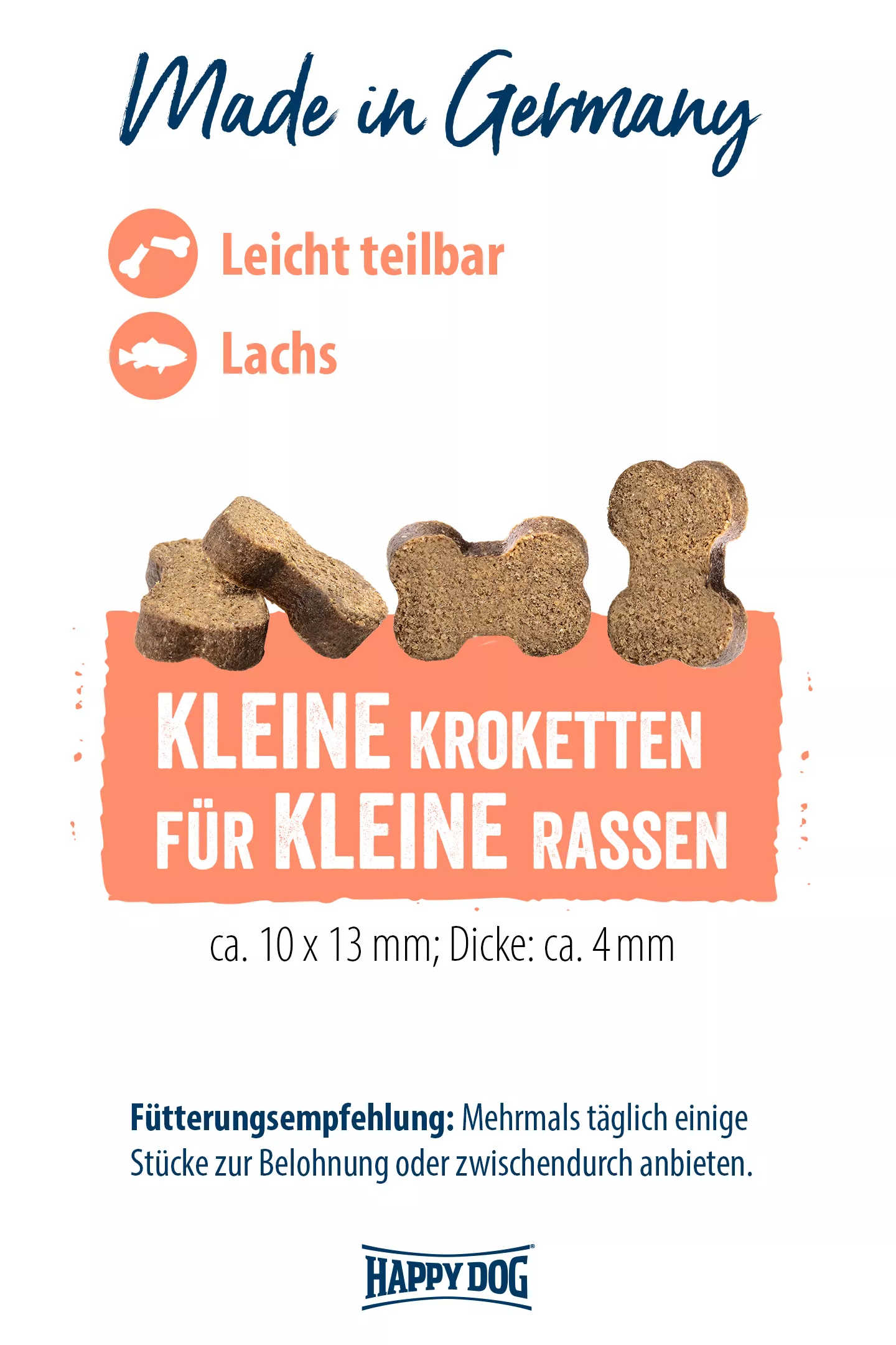 Der zuckerfreie Trainingssnack mit schmackhaftem Lachs eignet sich hervorragend zum Belohnen oder Verwöhnen kleiner Hunde. Auch hier achten wir auf Regionalität der Produkte und eine ausgewogene Proteinvielfalt. Der kleine Trainingssnack mit der Extraportion an Heimatliebe ist durch seine Knochenform sehr leicht teilbar und so auch für die Kleinsten perfekt geeignet.