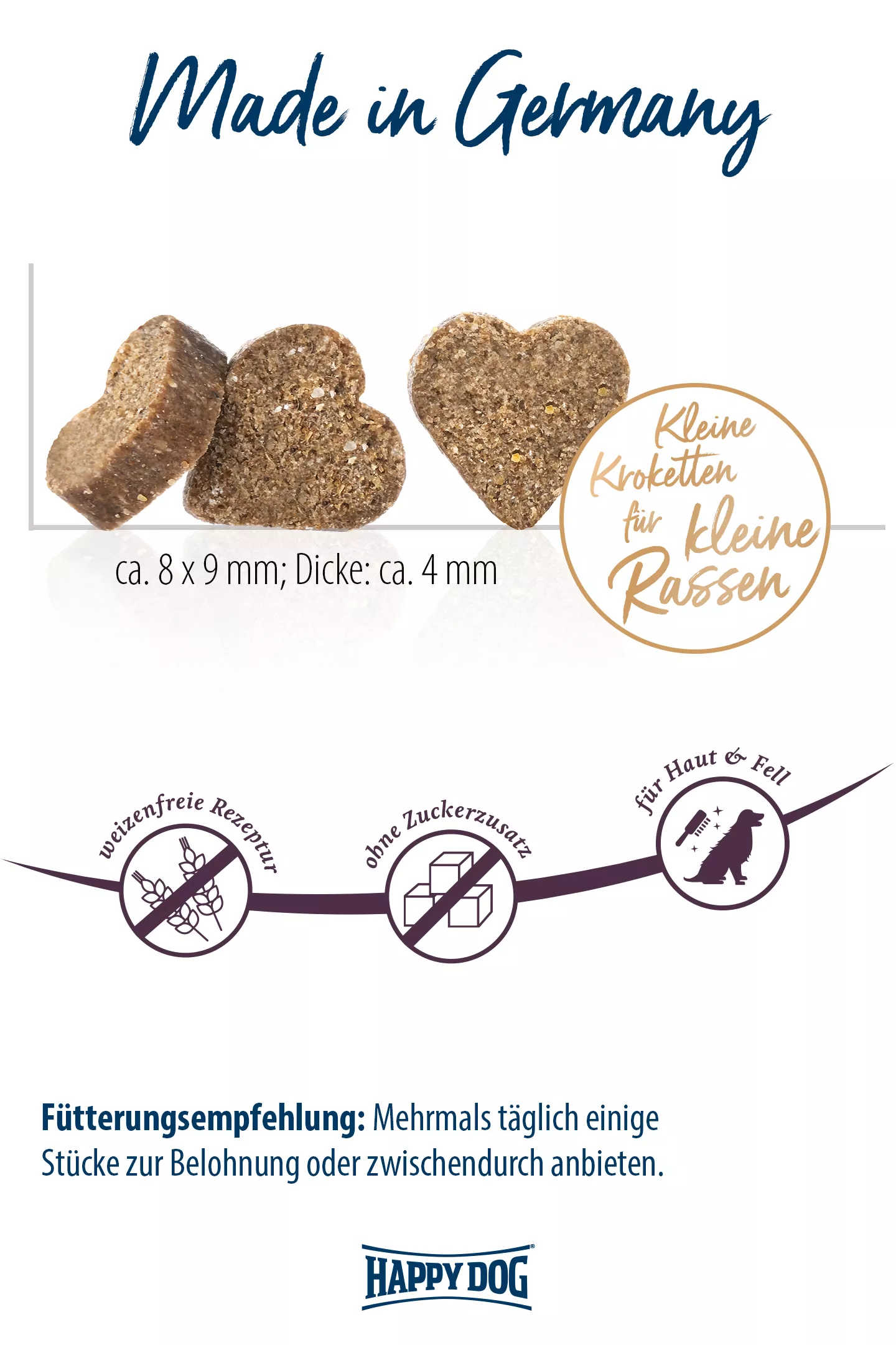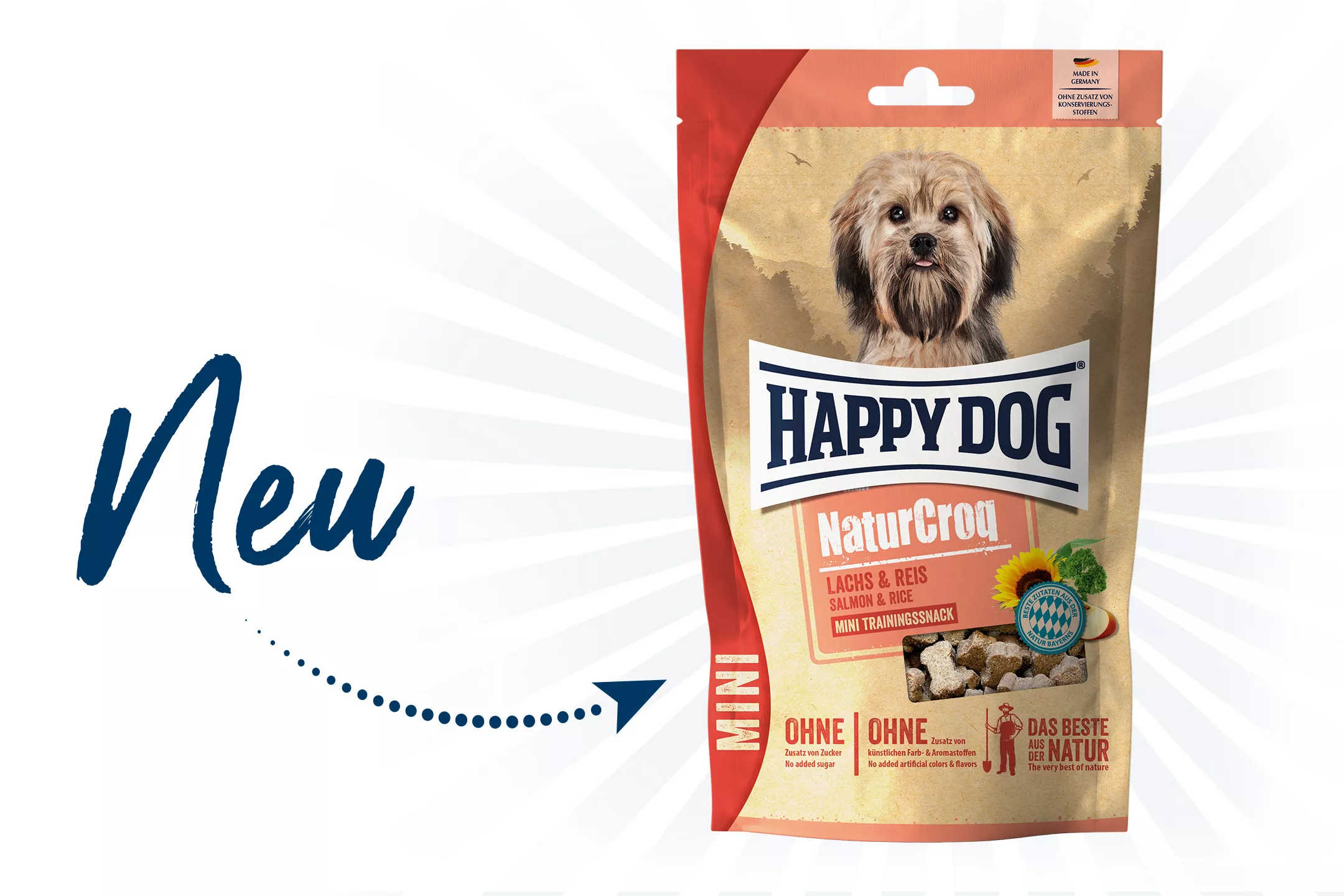 Ebenso wie unser Trockenfutter Happy Dog NaturCroq Lachs & Reis so enthält auch unser Happy Dog NaturCroq Mini Lachs & Reis Trainingssnack die richtige Portion an Omega-3- und Omega-6-Fettsäuren, welche eine intakte Haut und ein glänzendes Fell unterstützen. Sollte dein kleiner Hund ein etwas stumpfes Fell haben, dann empfehlen wir dir ihm beim Training oder zum Belohnen zwischendurch ein paar unserer köstlichen Leckerlis für kleine Hunde zu geben.