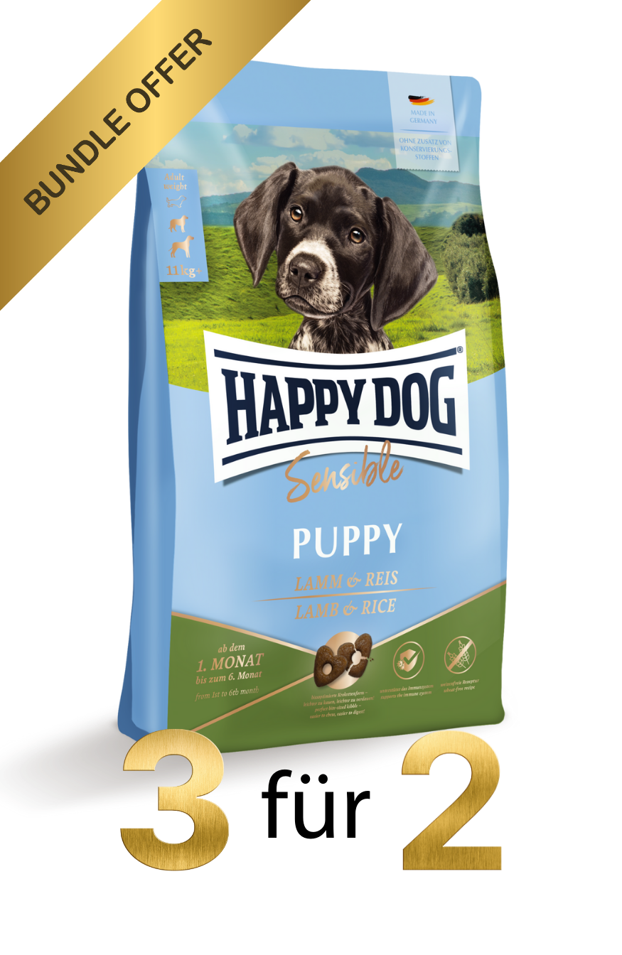 Ab der 4. Lebenswoche bis einschliesslich zum 6. Lebensmonat eignet sich Happy Dog Sensible Puppy Lamm & Reis ideal. Ab dem 7. Lebensmonat sollte das Welpenfutter langsam auf Happy Dog Sensible Junior Lamm & Reis umgestellt werden. Denn während der Junghundphase wächst dein tierisches Familienmitglied langsamer – und benötigt daher eine weniger gehaltvolle Nahrung.