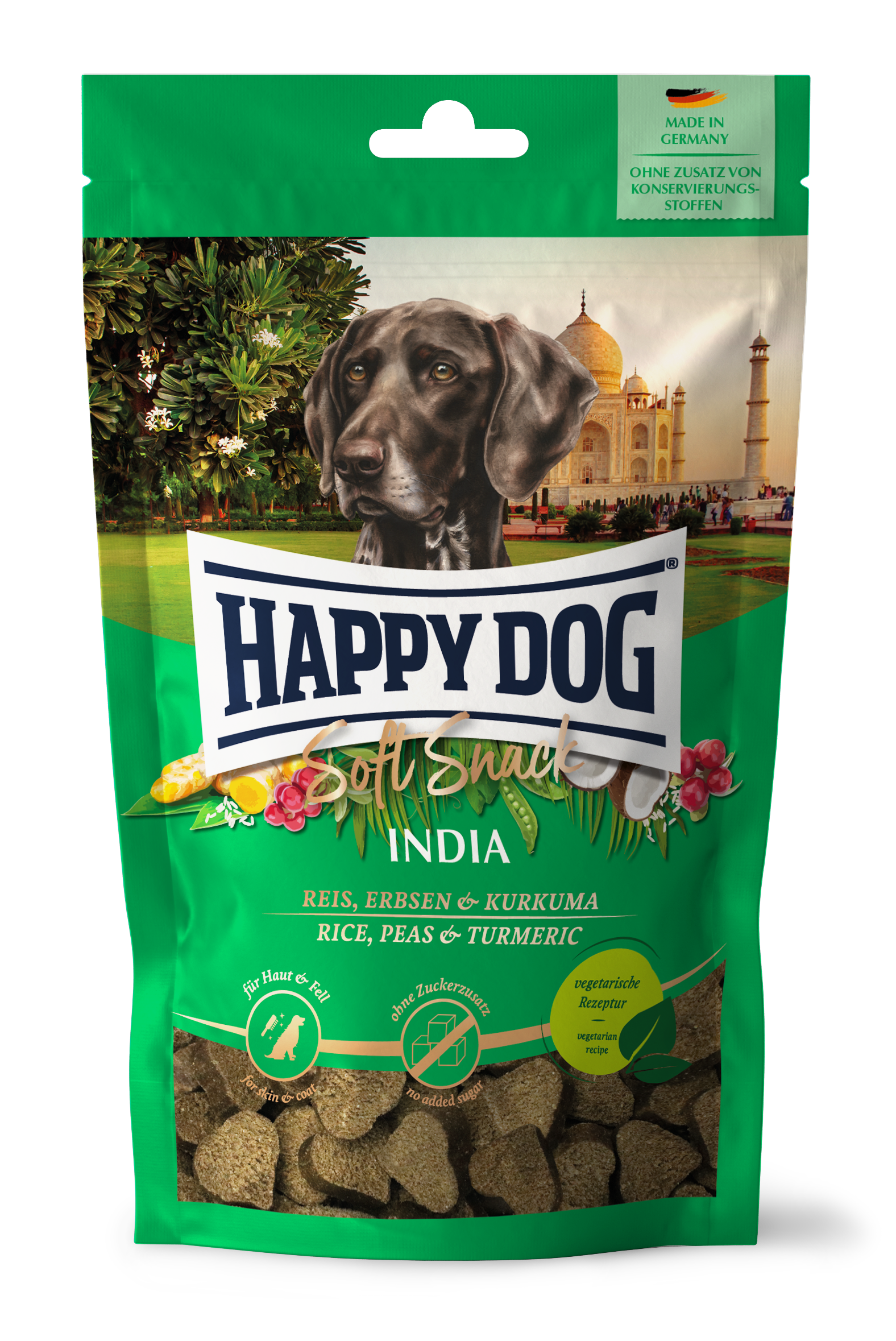 Der herzförmige Soft-Snack Happy Dog India ist ideal zum Verwöhnen deines Lieblings oder als kleine Mahlzeit für zwischendurch. Die Kombination aus gut verträglichem Reis und Erbsen mit den wertvollen Eigenschaften von Cranberries, Kokos und Kurkuma ist ein wahres Geschmackserlebnis für anspruchsvolle Gourmets. Der vegetarische Snack eignet sich auch optimal für sensible sowie anspruchsvolle Hunde mittlerer und großer Rassen und ist tierärztlich empfohlen bei Futtermittelunverträglichkeiten. Natürlich werden die Snacks mit einer Rezeptur ohne den Zusatz von Zucker und Konservierungsstoffen hergestellt und haben einen Wiederverschluss, der für langanhaltende Frische sorgt. Genussvolle Verwöhnmomente garantiert !